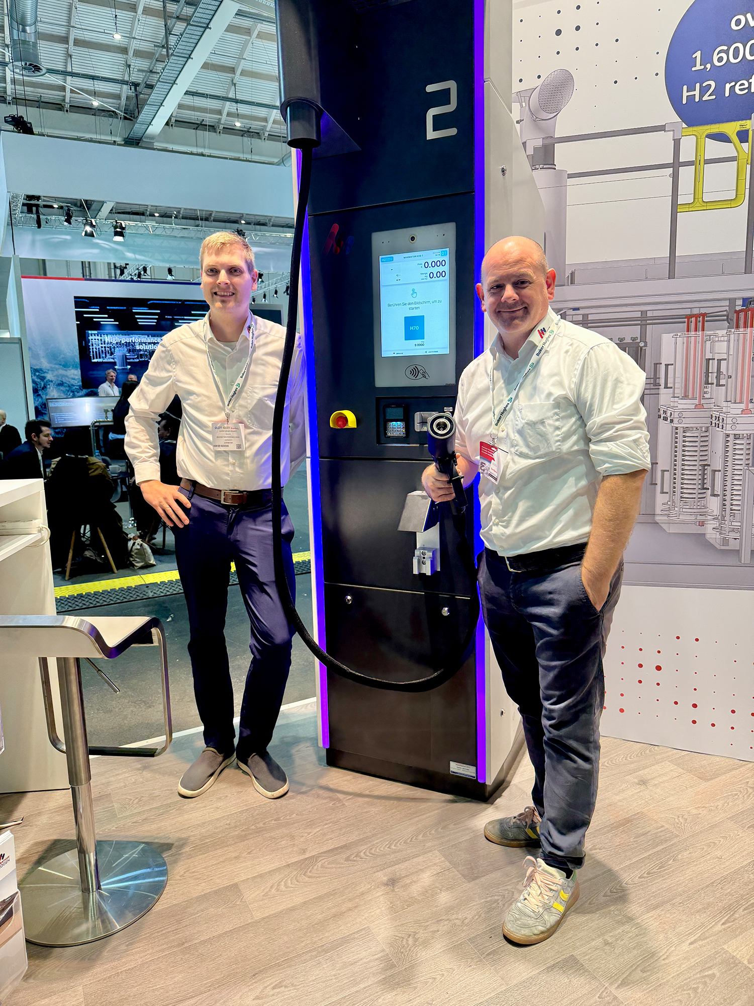 Auch Ruben Heidenreich von Knauber besuchte uns bei seinem Rundgang durch die Hallen am Stand und freue sich über die Präsenz von Knauber auf unserer Mitgliederübersicht – das war ihm direkt ein Foto wert. Knauber hat in seinem H2-Portfolio insbesondere den Transport von Wasserstoff bis zum Kunden vor die Tür.
