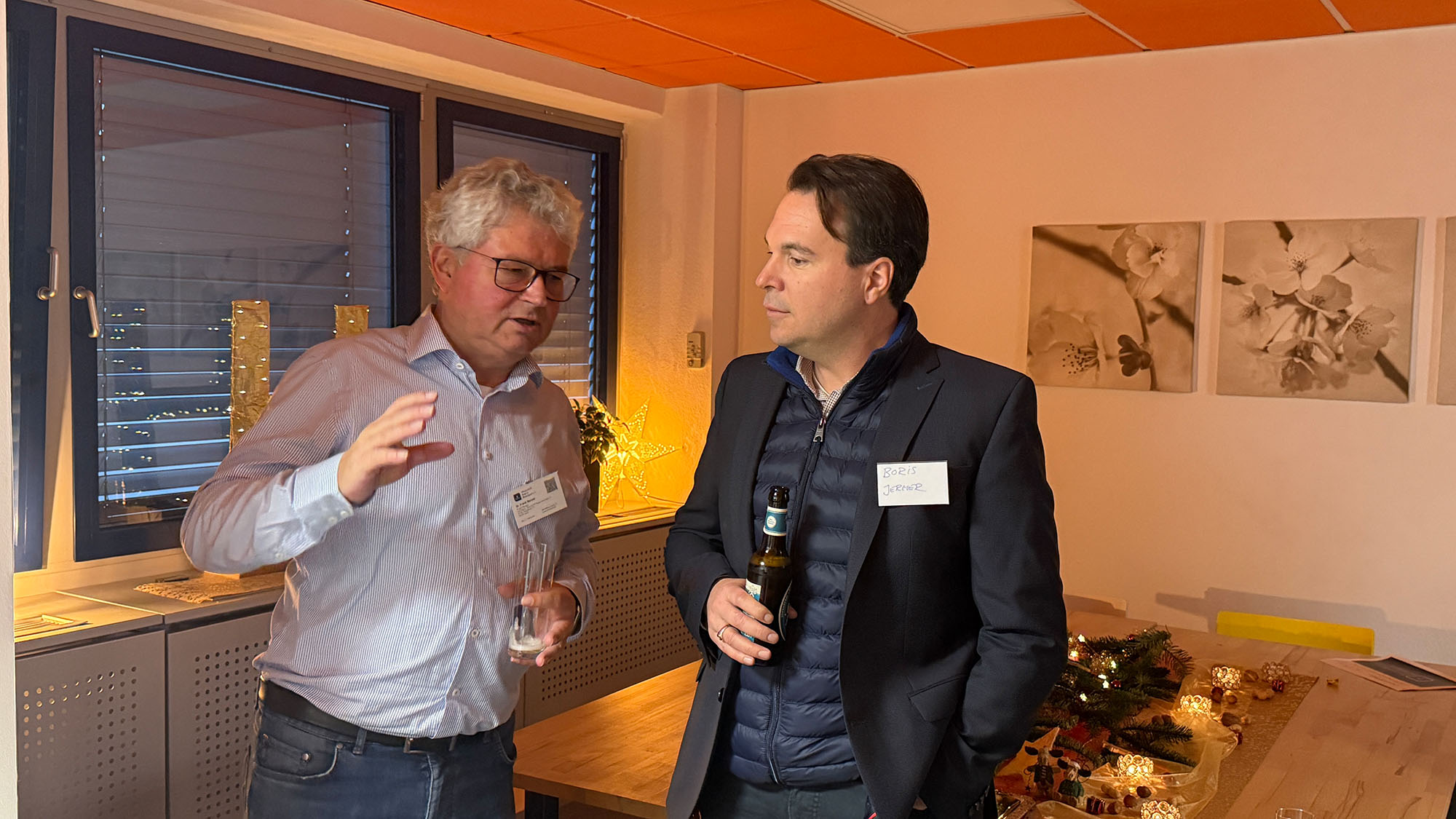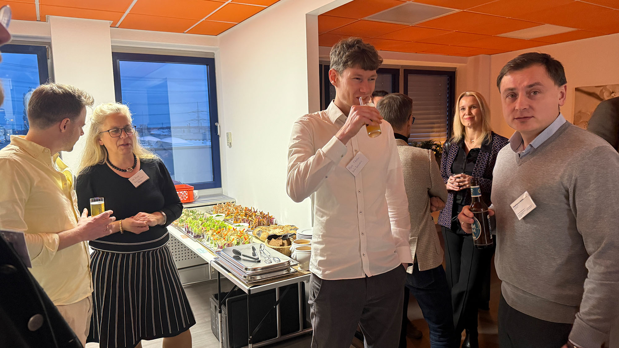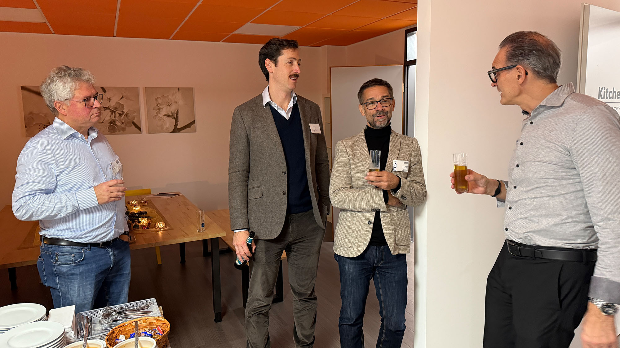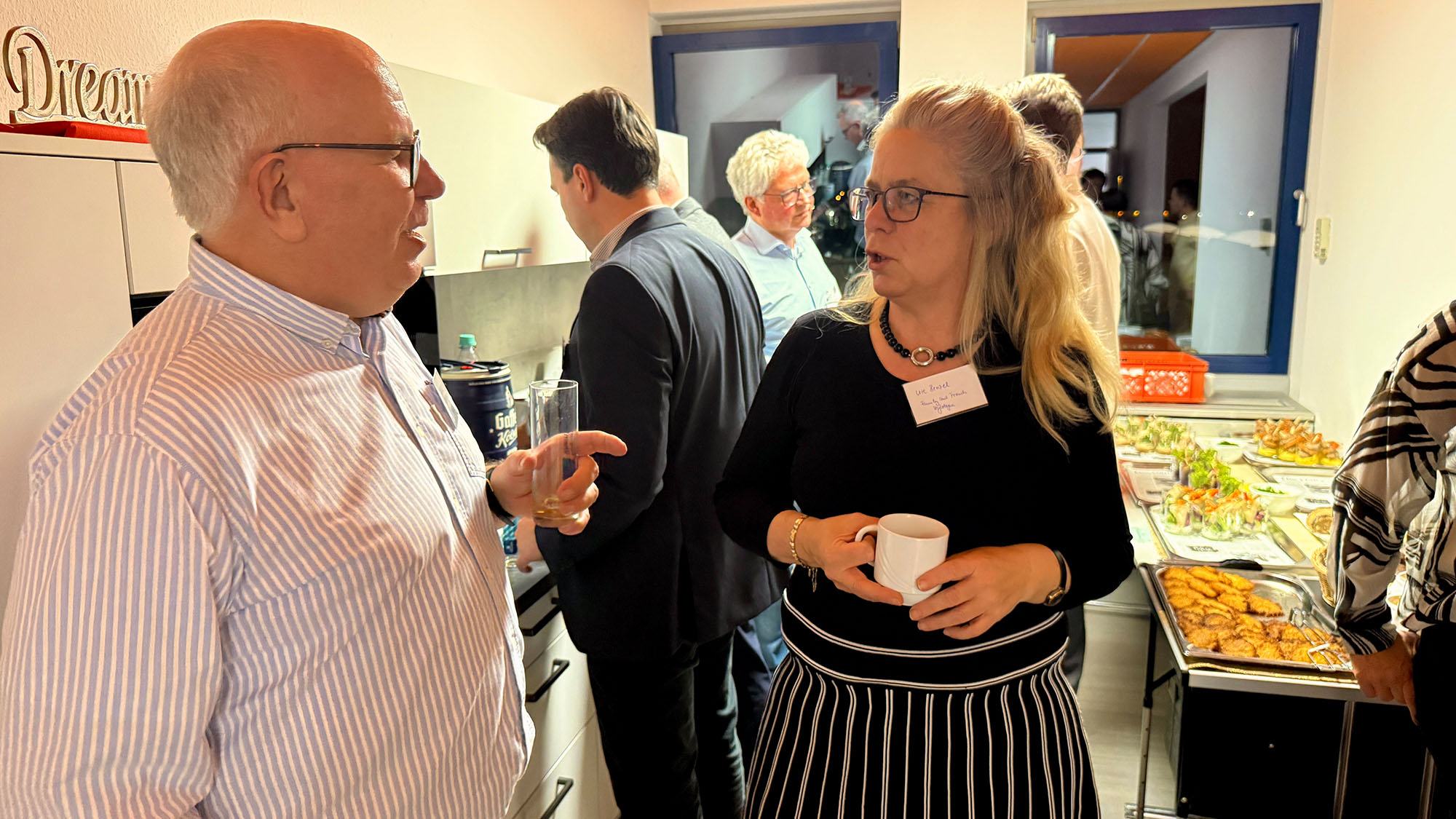 Schon schnell war klar: Ziel erreicht. Wie bei jeder guten Party war das Zentrum die Küche. Zu zweit oder in kleinen Grüppchen standen die Vertreter unserer Mitglieder zusammen und waren sofort ins Gespräch vertieft. Wie von unsichtbarer Hand gesteuert, bildeten sich in den kommenden über drei Stunden immer wieder neue Grüppchen mit neuen Themen – ob nun H2-Tankstellen oder Fußball-Mittelrheinliga. Informationen, Ideen und Visitenkarten tauschten die Besitzer.