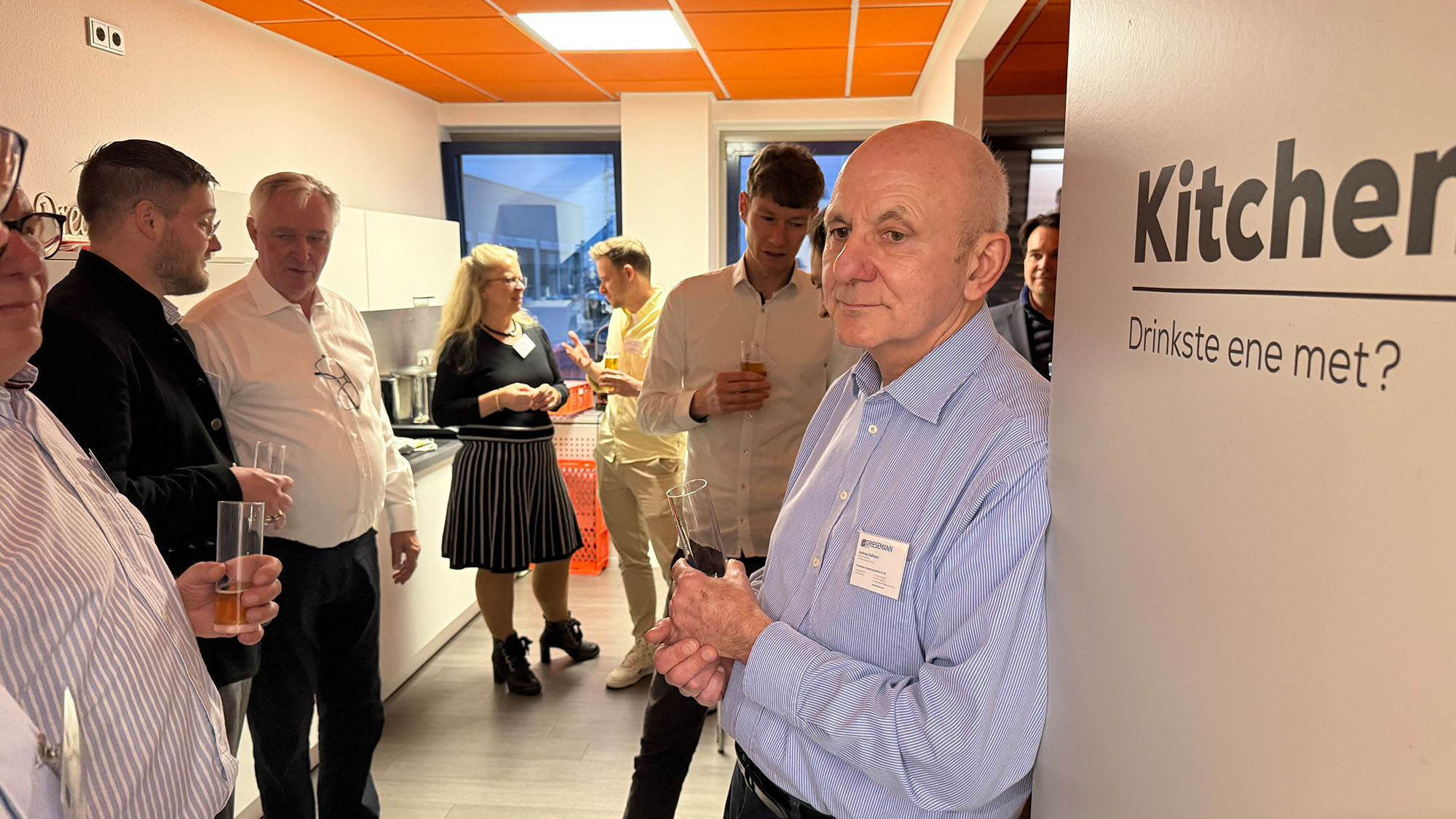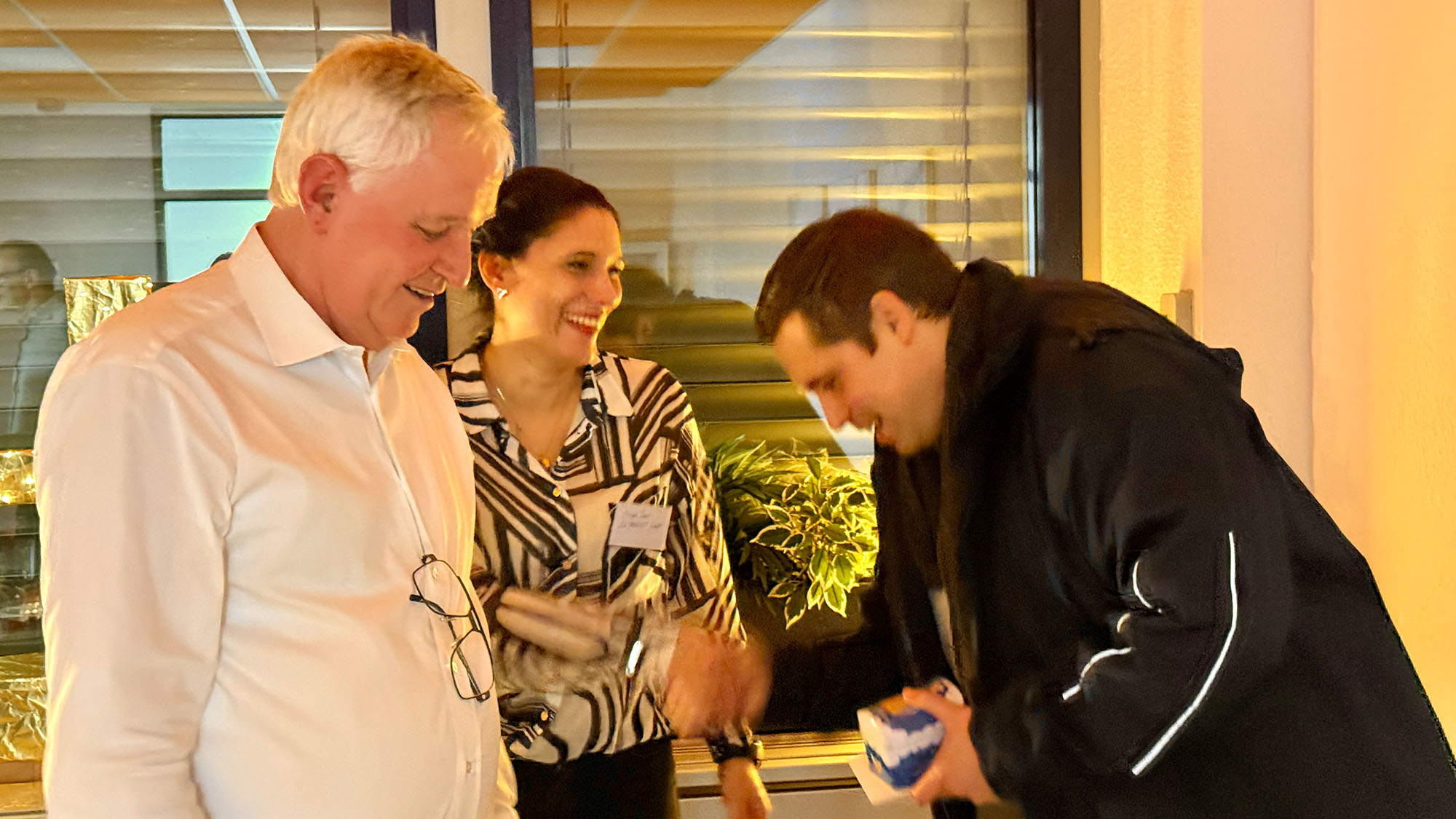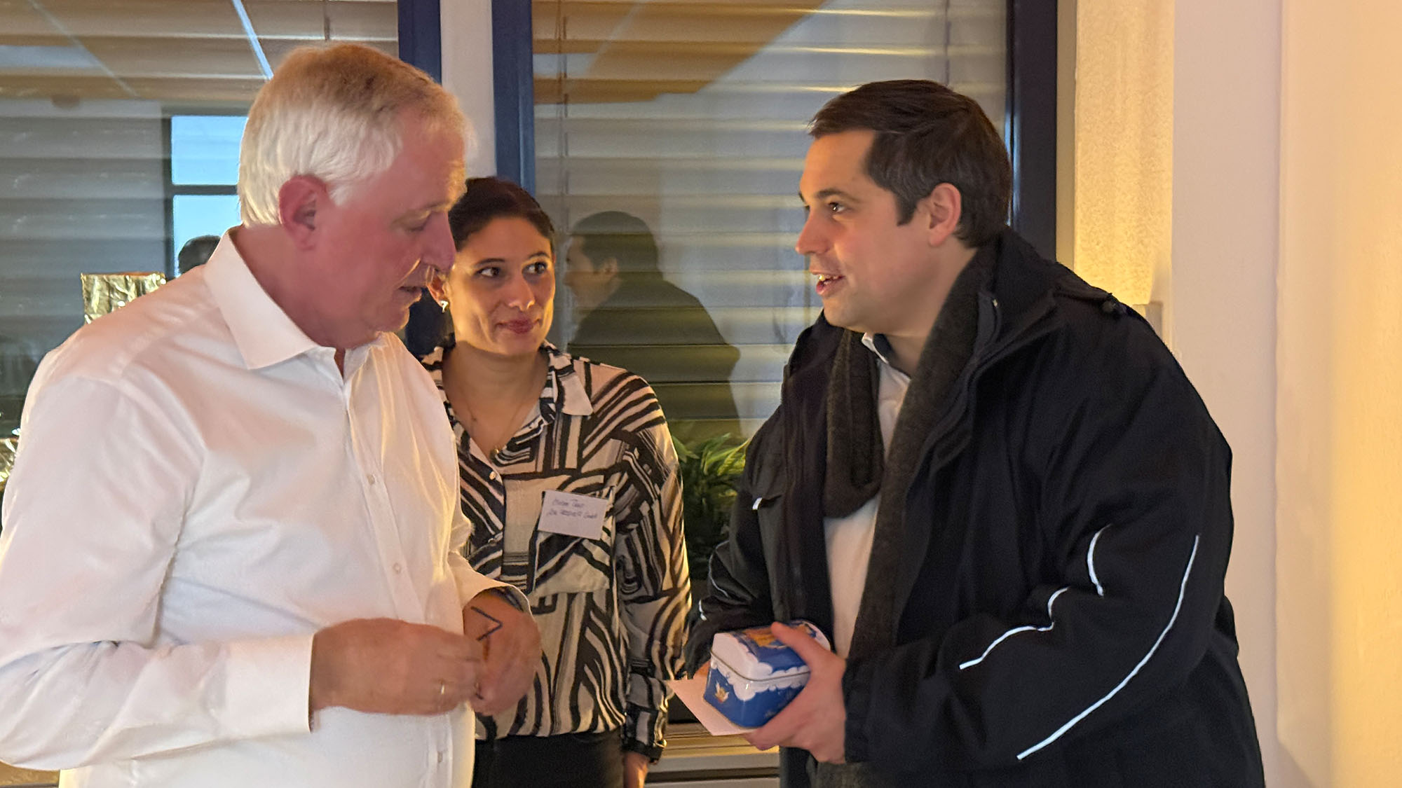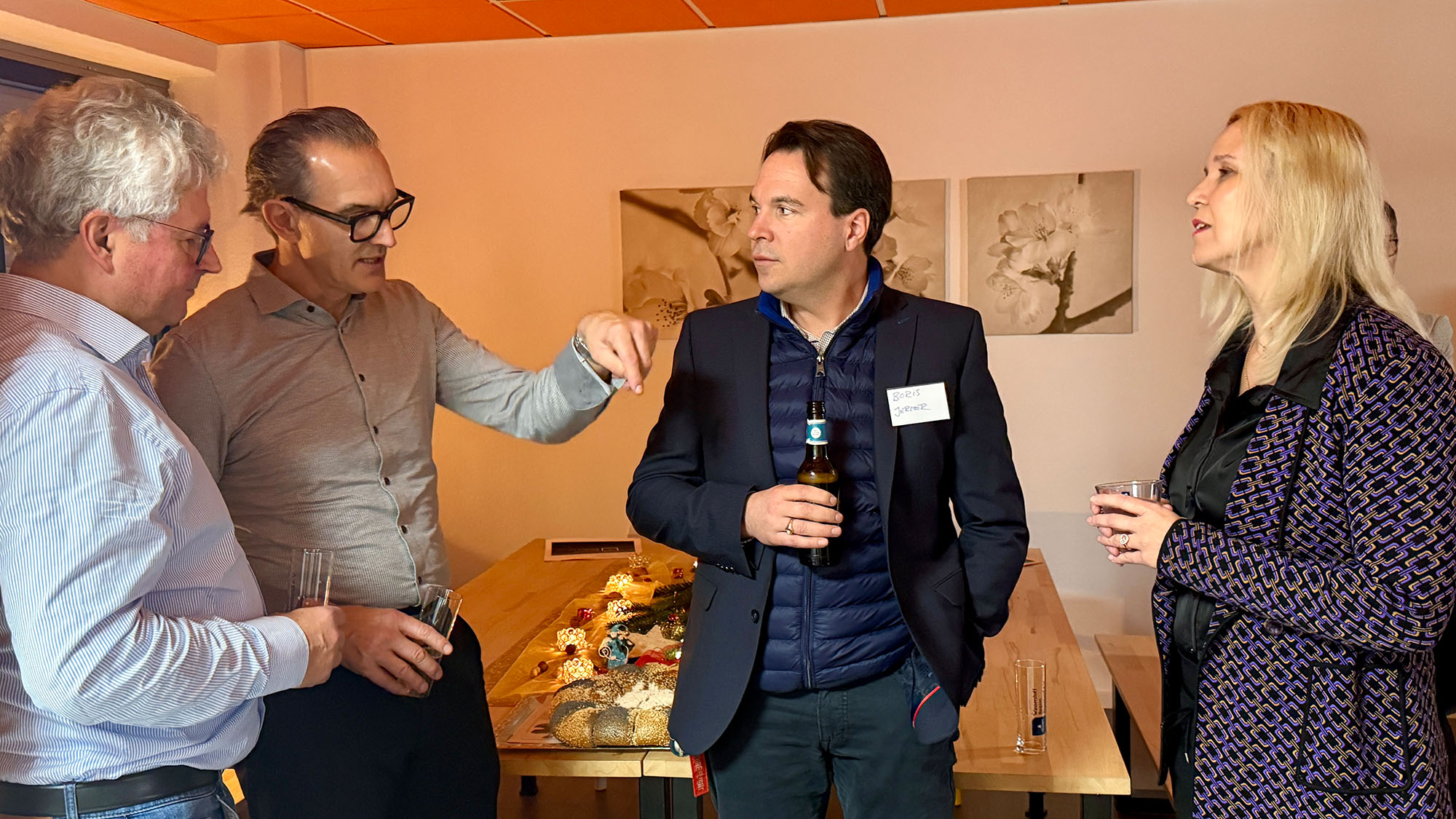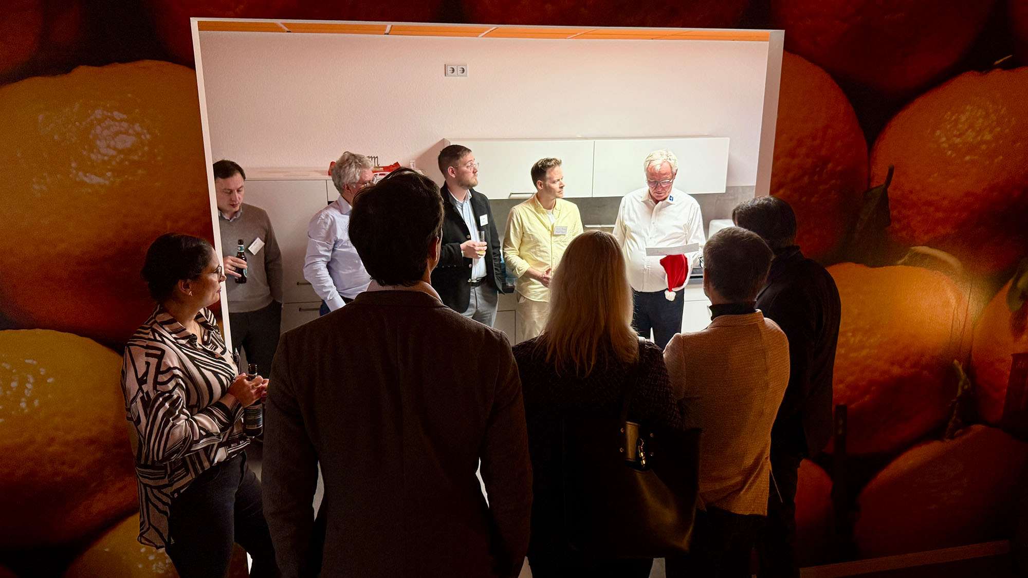 Schon schnell war klar: Ziel erreicht. Wie bei jeder guten Party war das Zentrum die Küche. Zu zweit oder in kleinen Grüppchen standen die Vertreter unserer Mitglieder zusammen und waren sofort ins Gespräch vertieft. Wie von unsichtbarer Hand gesteuert, bildeten sich in den kommenden über drei Stunden immer wieder neue Grüppchen mit neuen Themen – ob nun H2-Tankstellen oder Fußball-Mittelrheinliga. Informationen, Ideen und Visitenkarten tauschten die Besitzer.