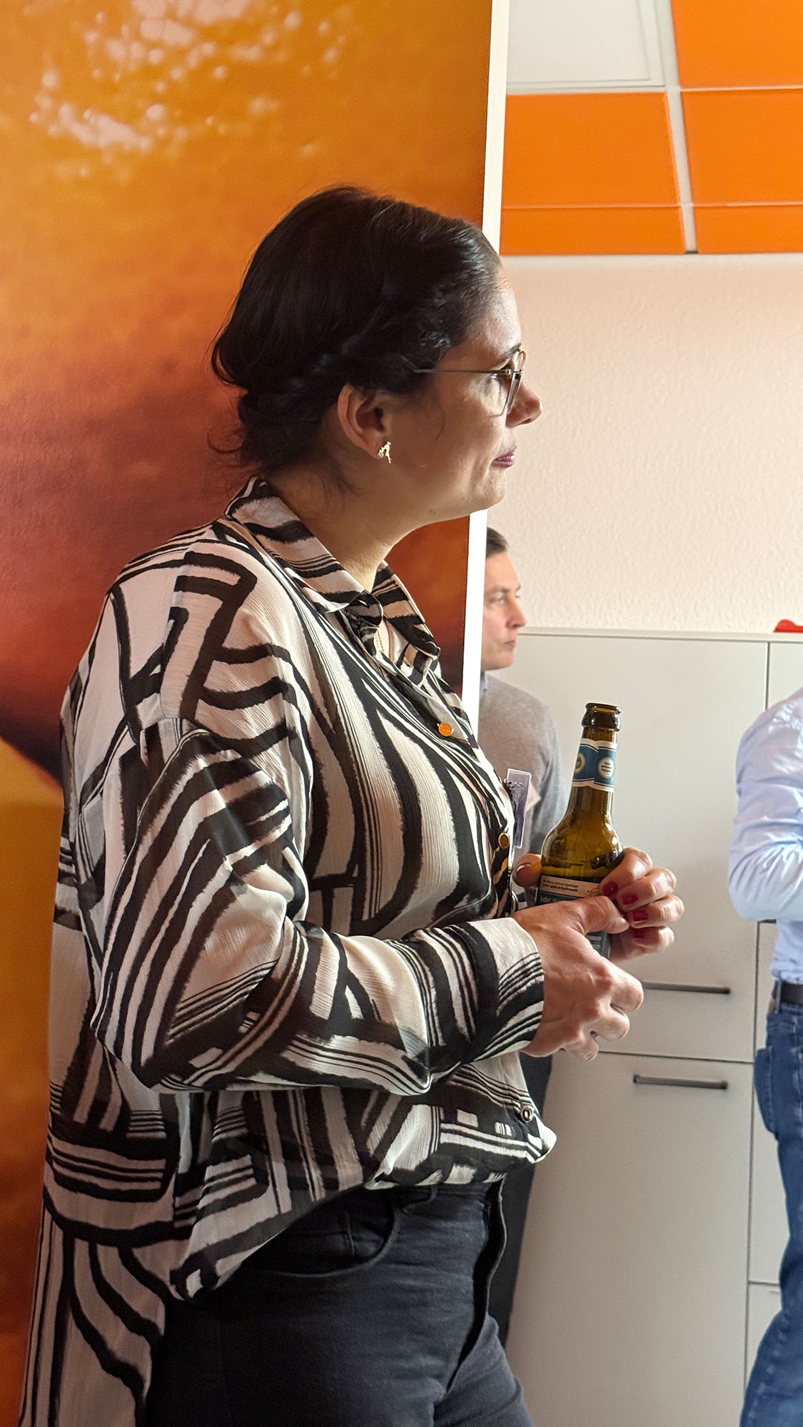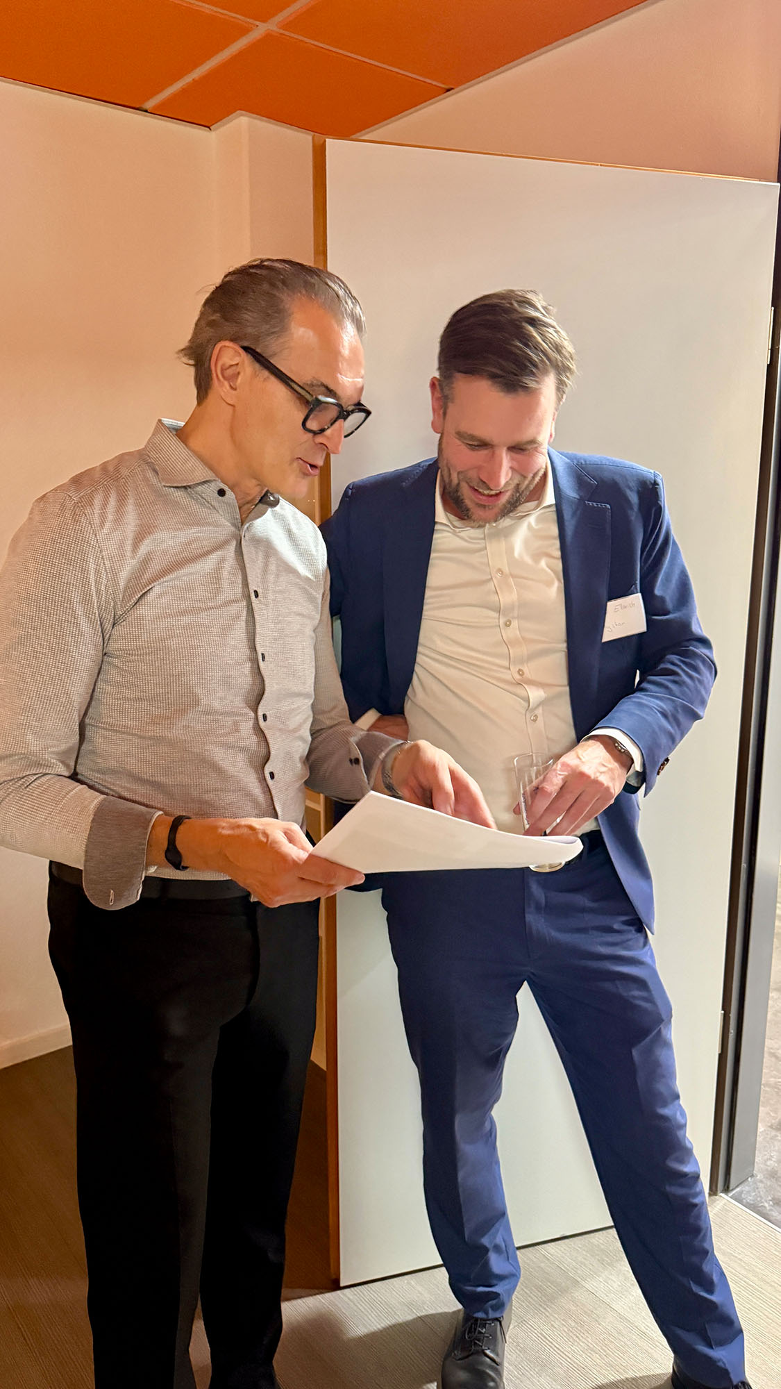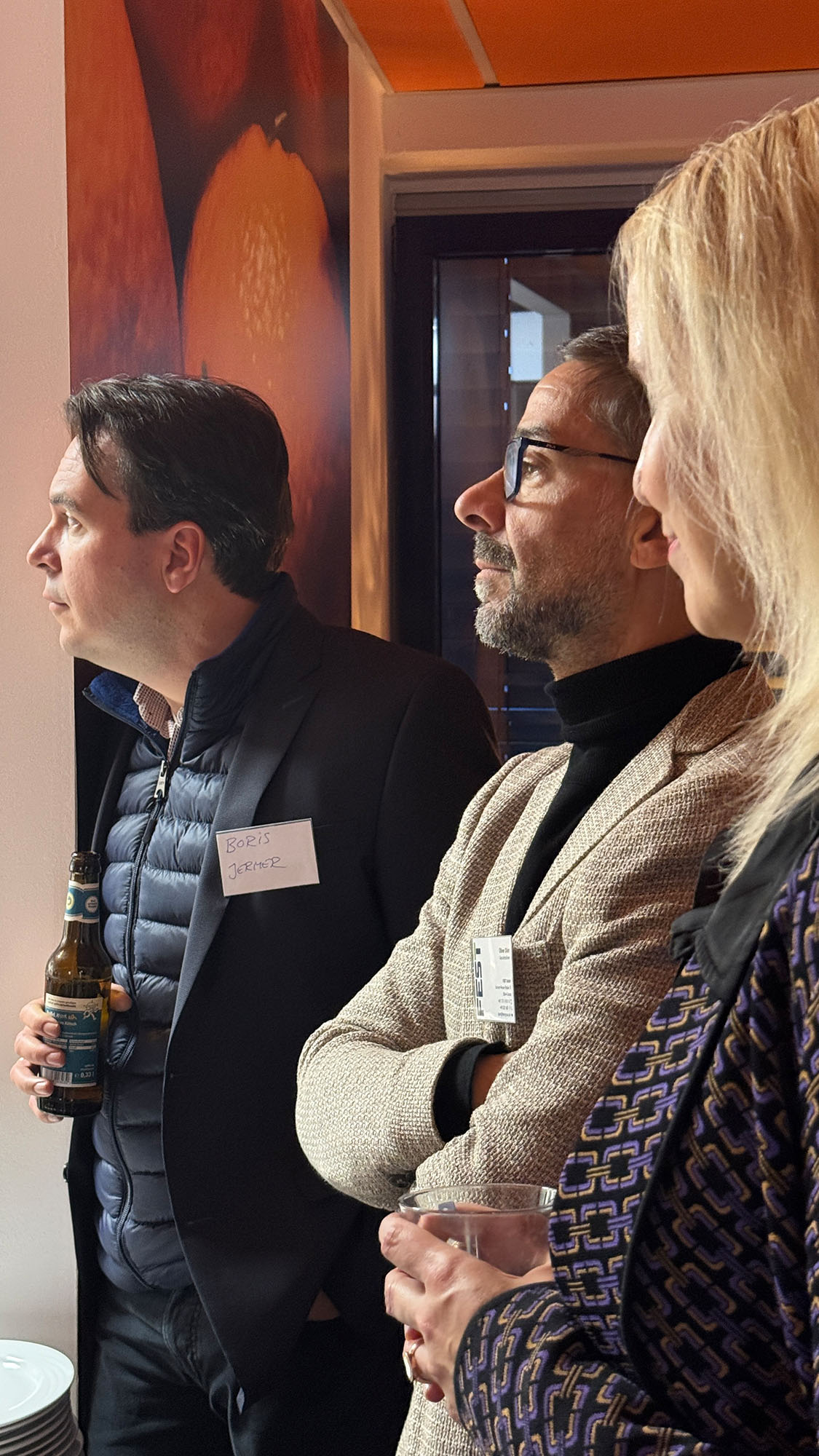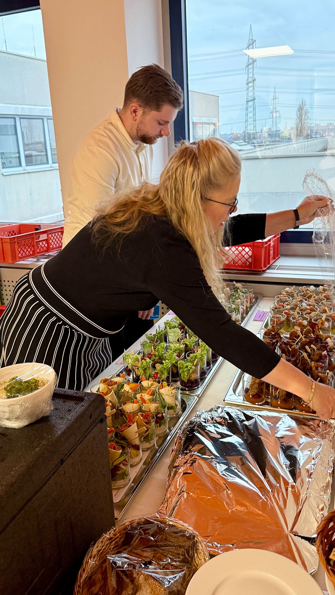 Schon schnell war klar: Ziel erreicht. Wie bei jeder guten Party war das Zentrum die Küche. Zu zweit oder in kleinen Grüppchen standen die Vertreter unserer Mitglieder zusammen und waren sofort ins Gespräch vertieft. Wie von unsichtbarer Hand gesteuert, bildeten sich in den kommenden über drei Stunden immer wieder neue Grüppchen mit neuen Themen – ob nun H2-Tankstellen oder Fußball-Mittelrheinliga. Informationen, Ideen und Visitenkarten tauschten die Besitzer.
