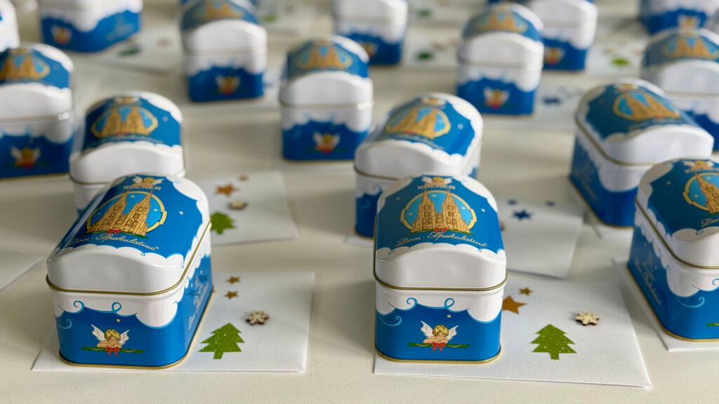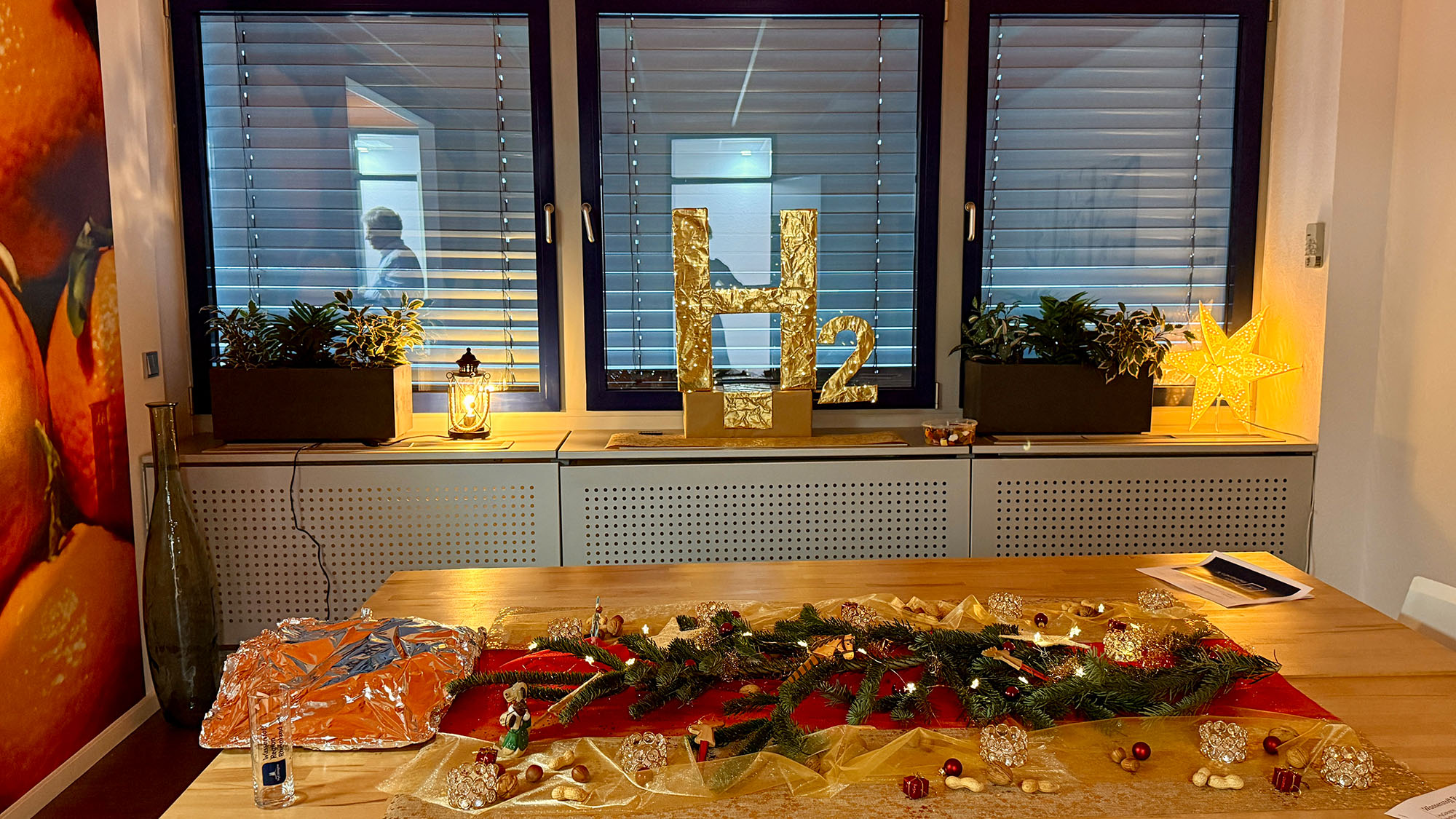 Vorangegangen waren ein paar Stunden intensiven Teamworks im HyCologne-Team. Der Chef besorgte eigenhändig noch einen Weihnachtsbaum, bevor er begann, die vielen Weihnachtskarten zu unterschreiben. Der nächste steckte diese in die handverzierten Umschläge, die Dritte klebte sie mit einem HyCologne-Aufkleber zu, der Vierte schrieb die Adressen derer, die nicht dabei sein würden, auf den Umschlag – und der Fünfte brachte sie zur Post. Die für die Gäste bildeten mit den Dosen voll Kölner Spekulatius eine zur Vereinsfarbe passende Deko auf dem sonstigen Sitzungstisch.
